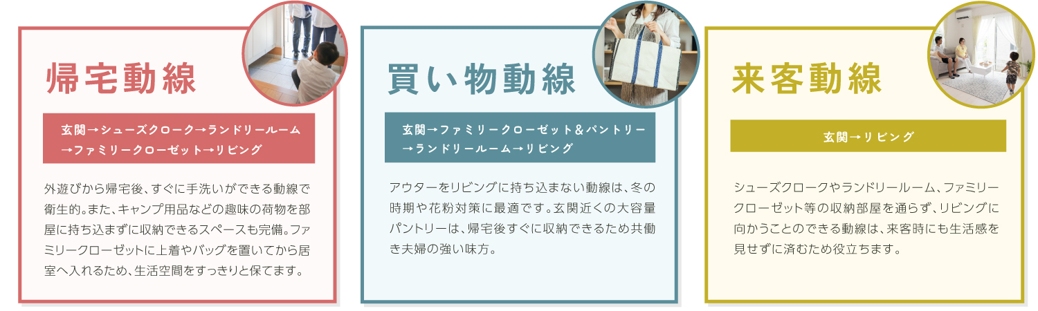 「「帰宅動線」「買い物動線」「来客動線」の3つの動線を確保。スムーズな動線設計により、移動のムダを削減。家事や生活のストレスを軽減します。