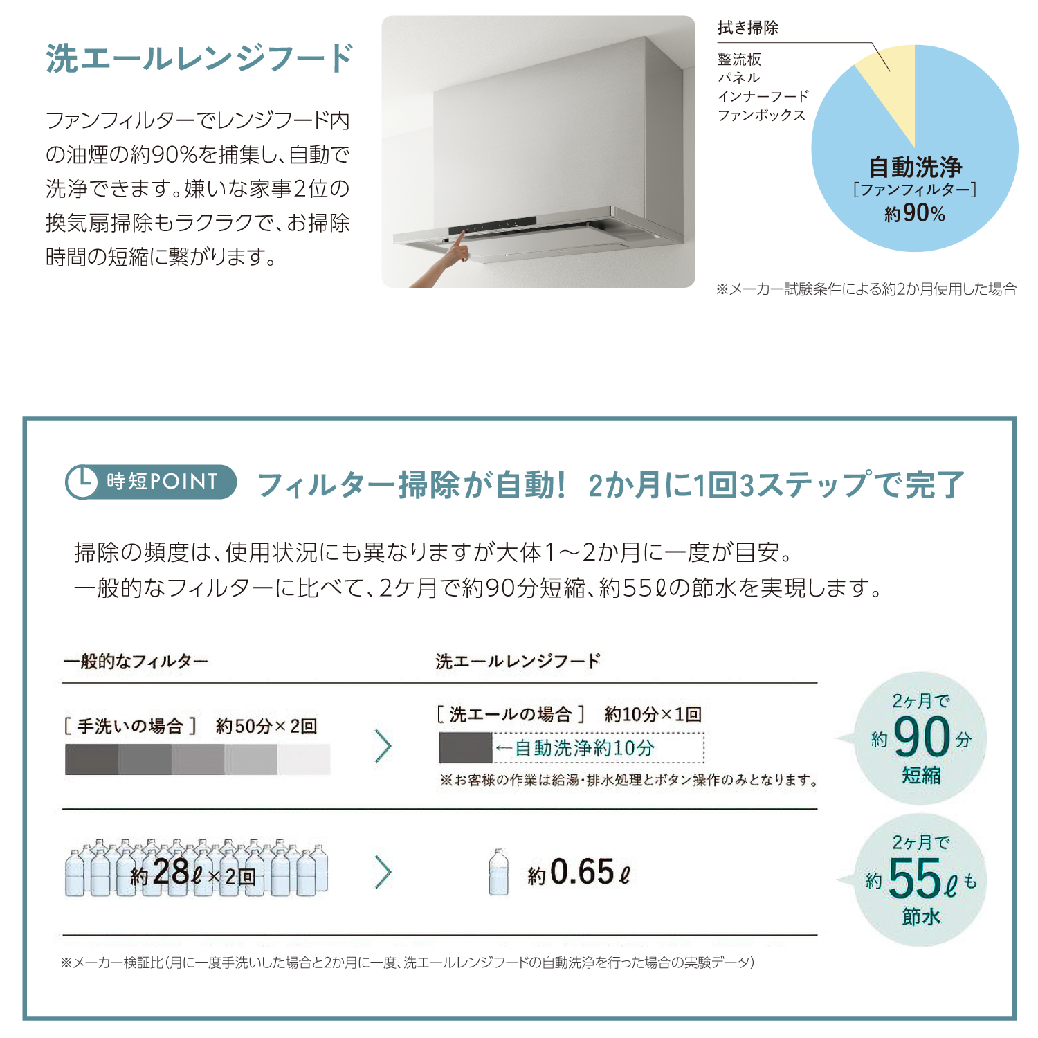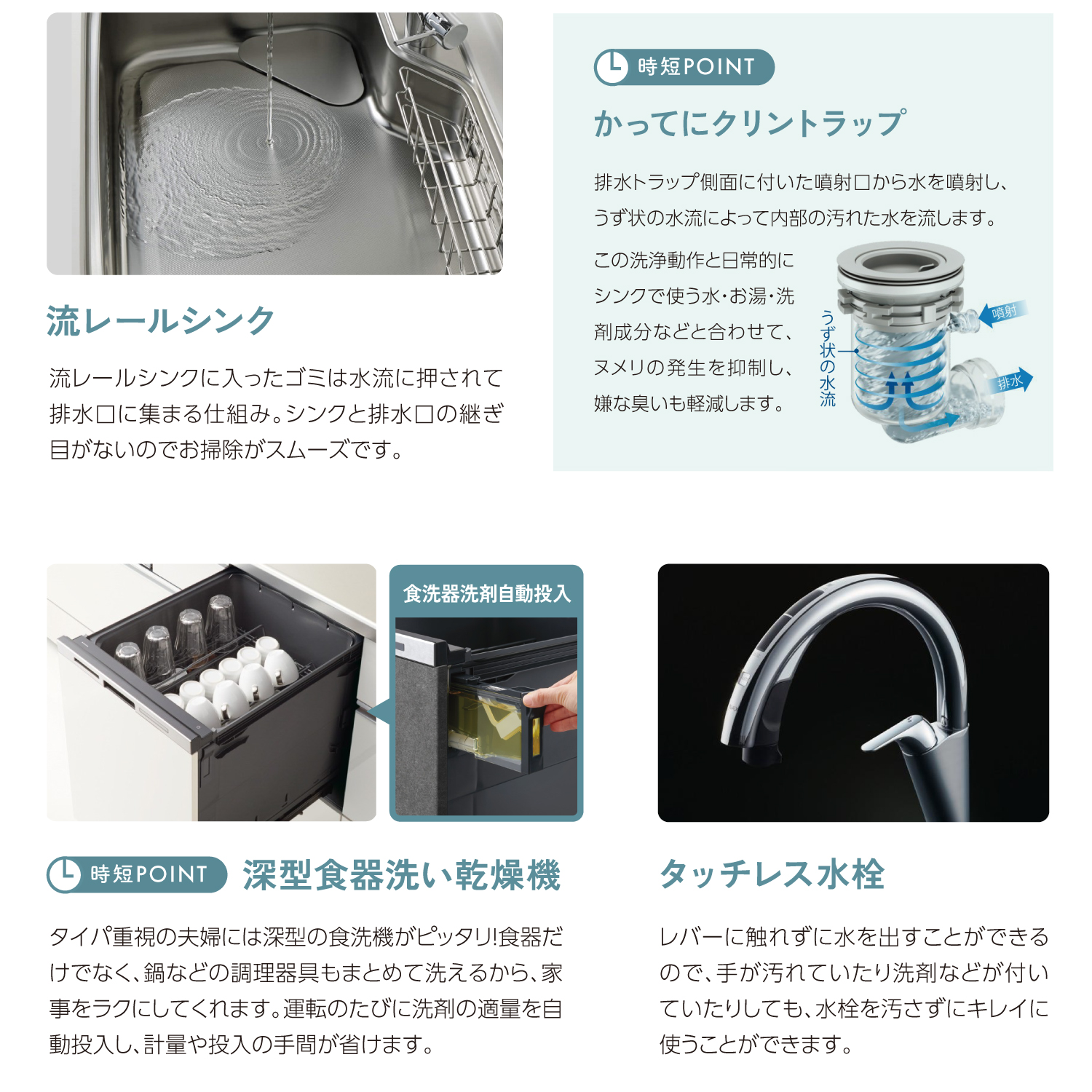 ファンフィルターを自動洗浄できるレンジフードやタッチレス水栓、洗剤自動投入機能付きの深型食器洗い乾燥機を採用。日々の家事負担を少しでも軽くし、家族の時間を豊かにするために、使いやすさと効率性にこだわったキッチンスペースです。