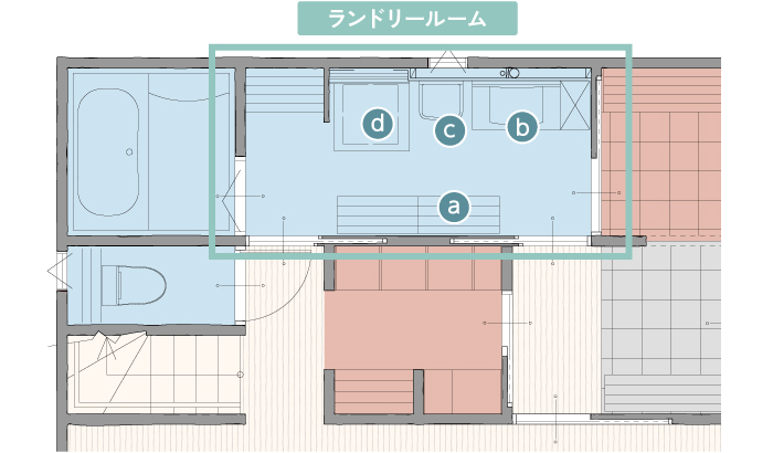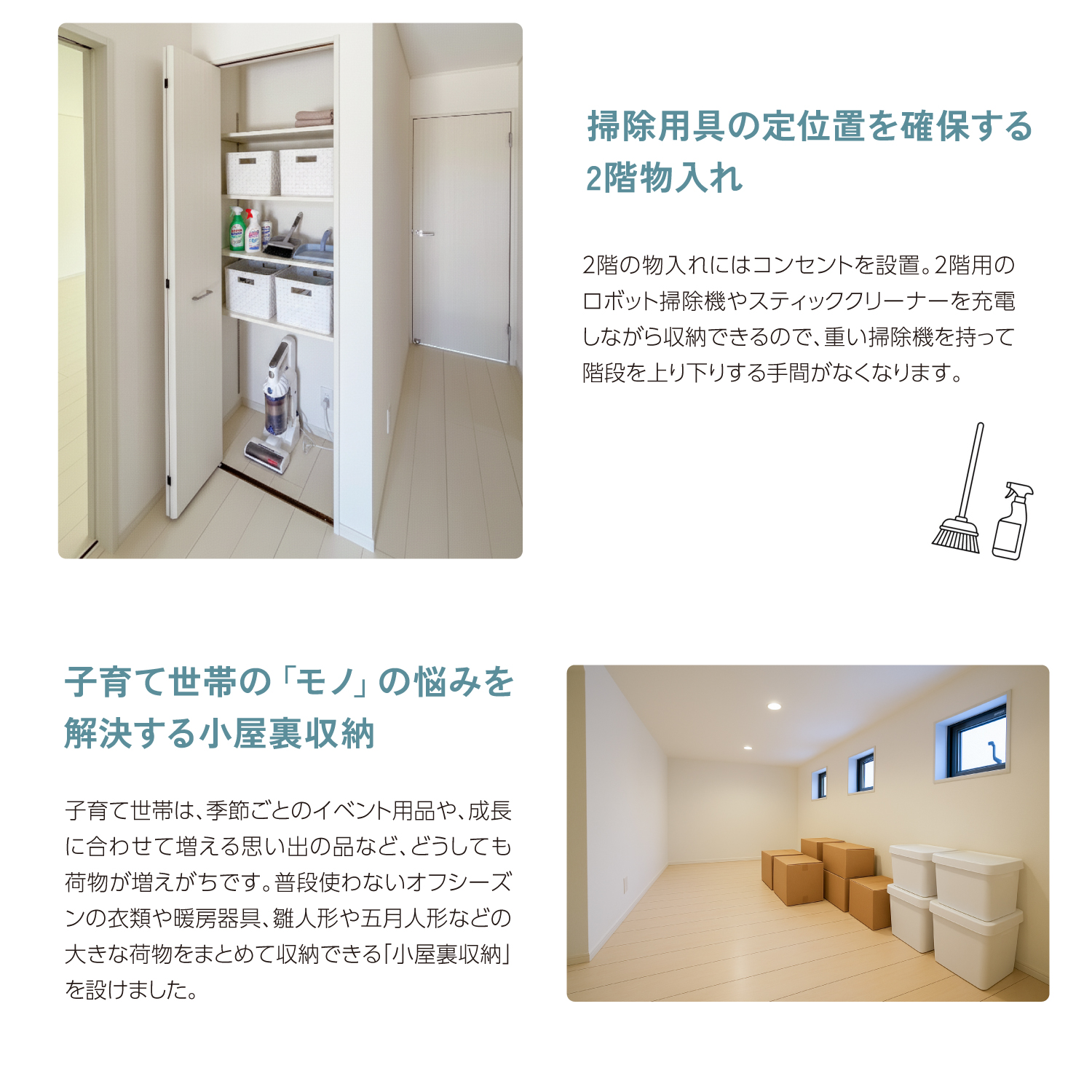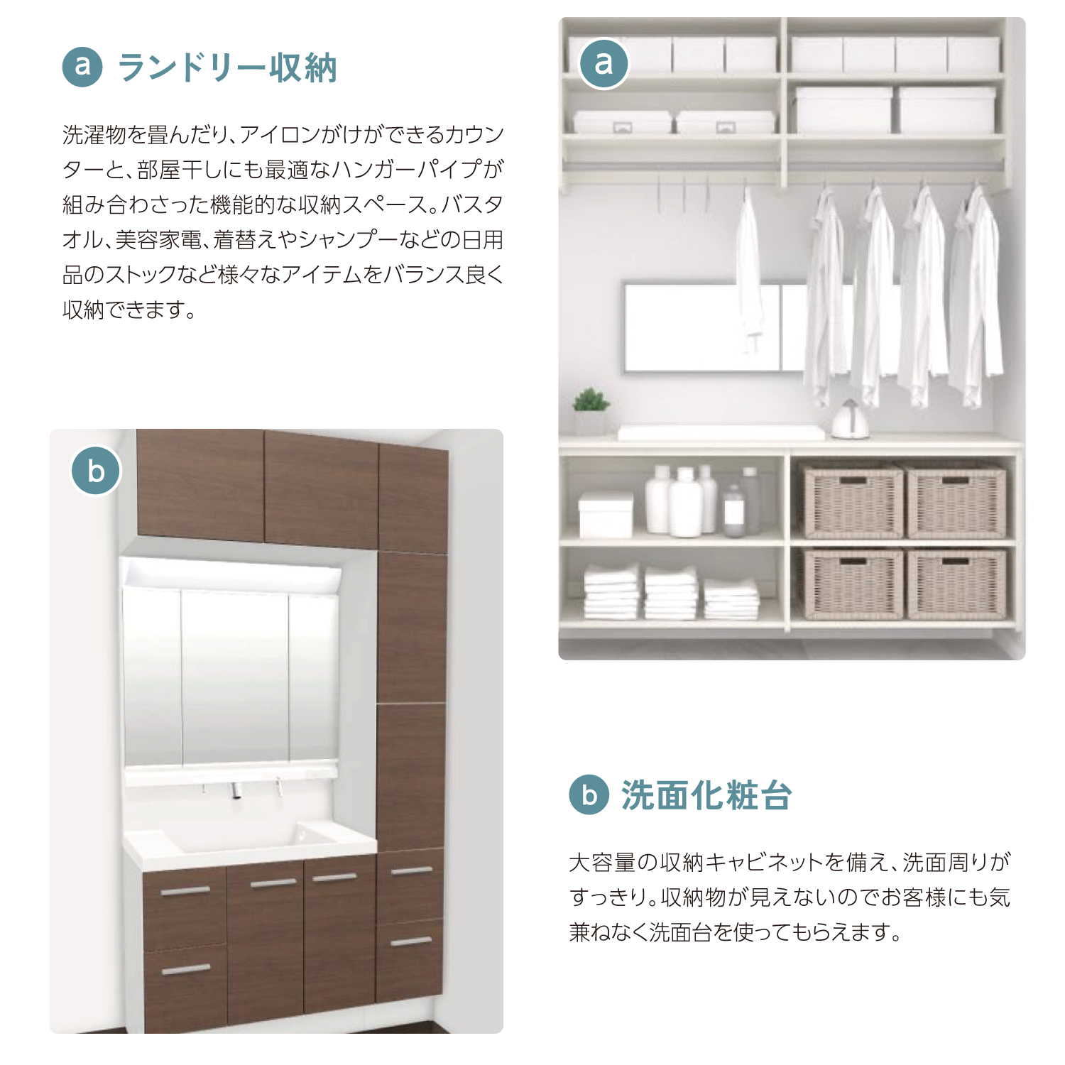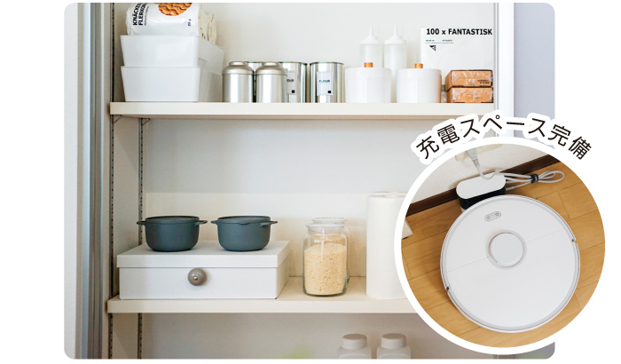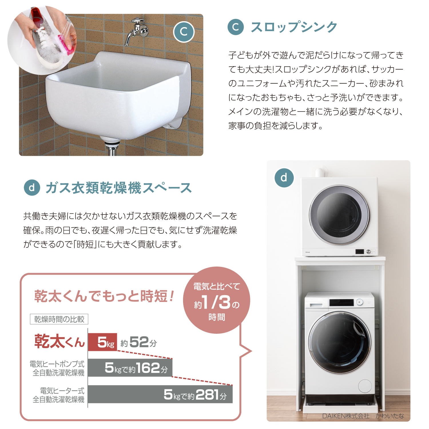 ロボット掃除機の充電スペースやガス乾燥機など、家電を活かすための専用スペースを設計段階から組み込み。家電と間取りの相乗効果で、日々の“家事時短”を実現します。
