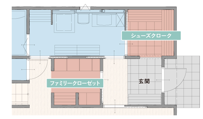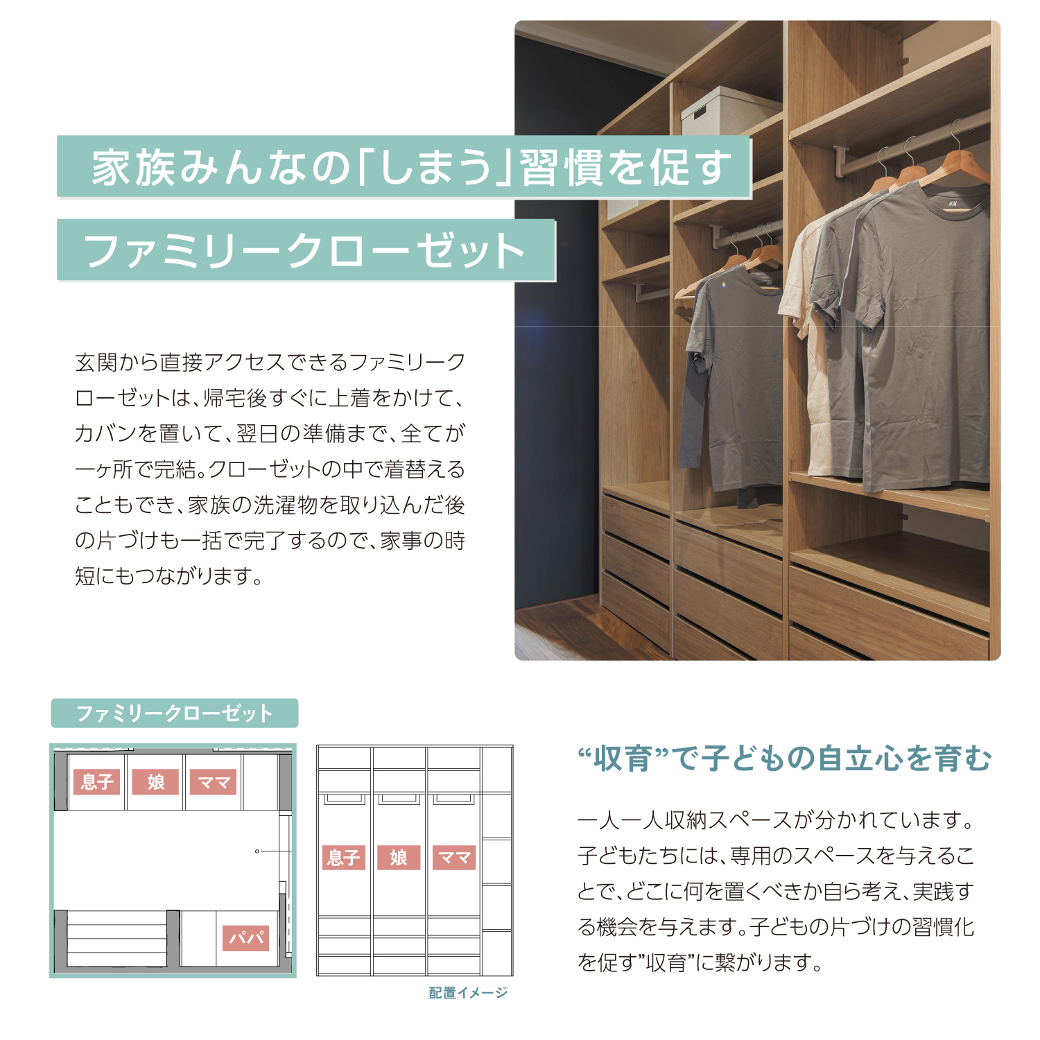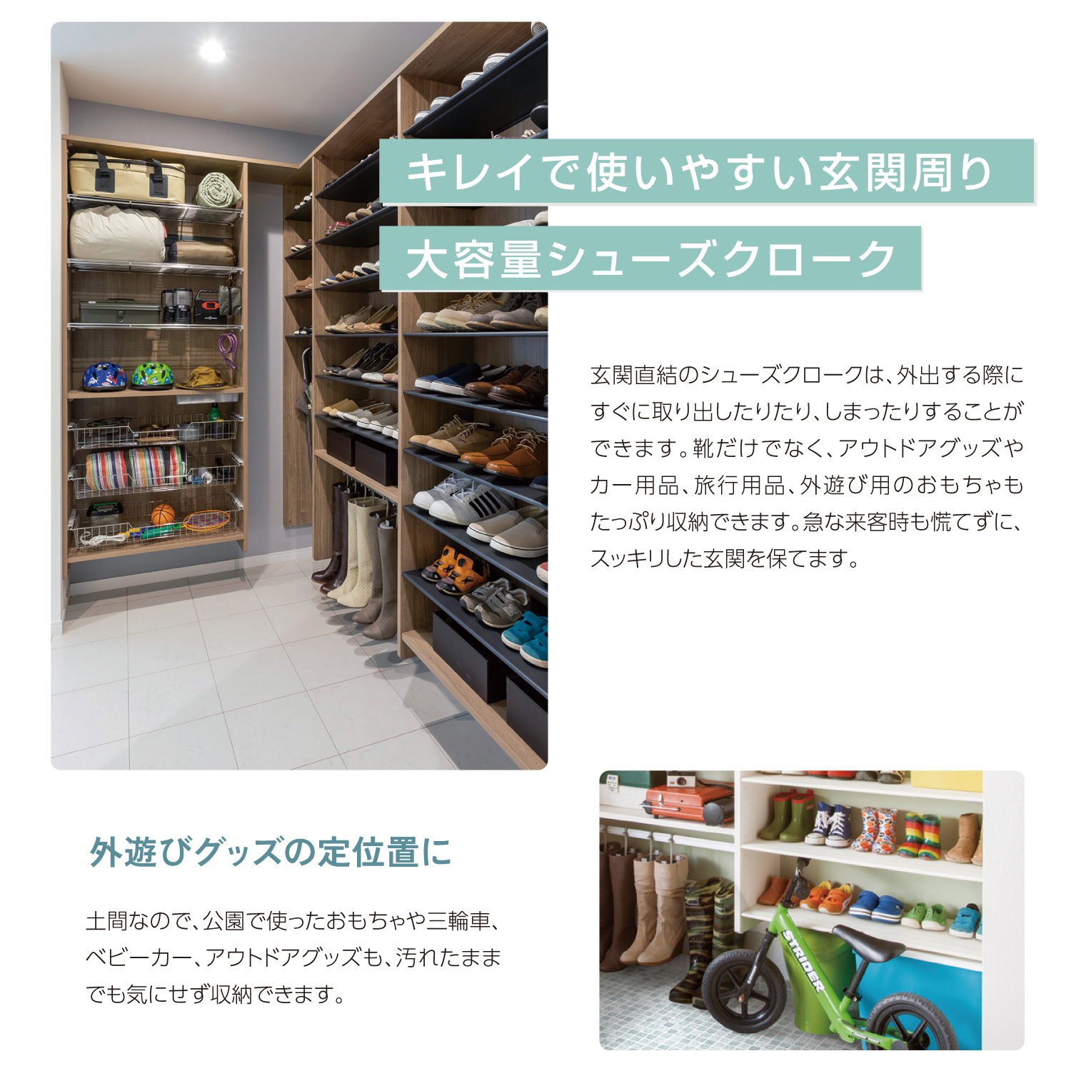共働き世帯にとって、毎日の玄関は慌ただしい場所になりがち。外出前の身支度、帰宅後の片付け。特に小さなお子さんがいるご家庭では、靴や上着、外遊びのおもちゃで散らかりやすいのが悩みです。そんな玄関の悩みを解決するために、2つの便利な収納空間を設けました。玄関から直接つながる「シューズクローク」と「ファミリークローゼット」が、ご家族の毎日をスムーズにします。