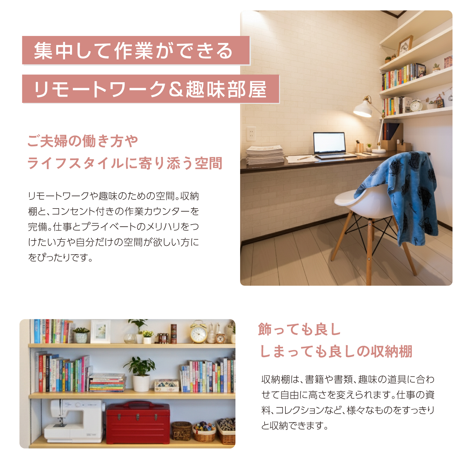 家族が集まるリビングはもちろん、趣味の空間やワークスペースもしっかりと確保。家族みんなで過ごす時間と、それぞれの一人時間、どちらも大切にできる間取りです。