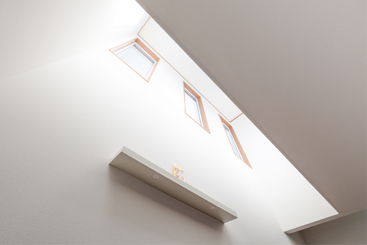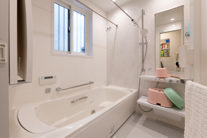 たっぷり光を取り入れる吹き抜けを採用し、外壁は雨で汚れが落ちるコーティングです。窓は夏や冬に快適な断熱性の高い素材。浴槽はボタンひとつで自動でお掃除でき便利です。