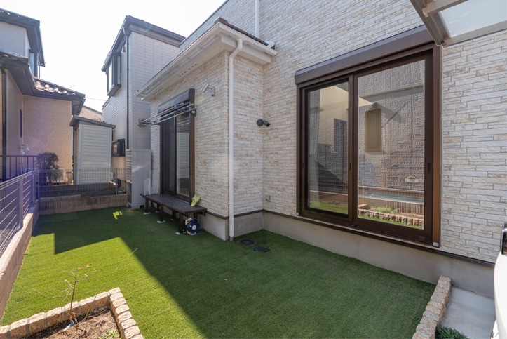 一番のこだわりは犬に優しい住まいというコンセプト。愛犬が怪我しないよう滑りにくいフローリングにし、庭にはドッグランを用意、2階の14帖テラスには犬用のプールを設置しいつでも愛犬と楽しめます。