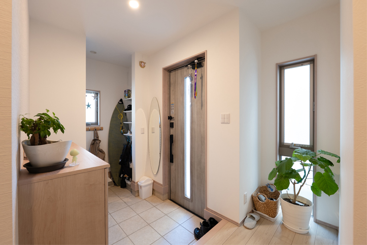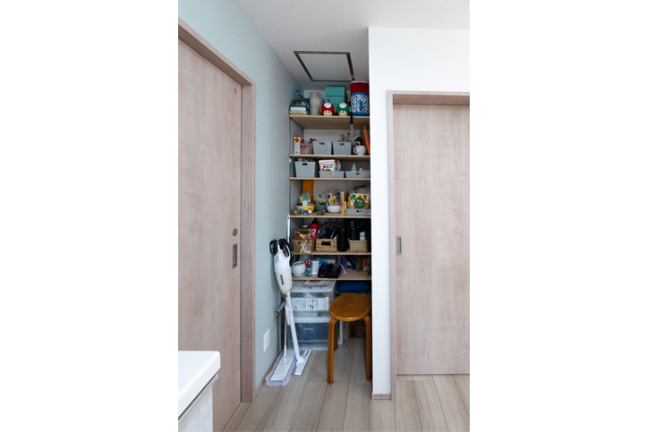 子どものために玄関を広く設計、シューズクロークを完備。玄関からキッチンに直行できる扉を作り、買い物したものをすぐに取り入れられます。空いたスペースを活用してパントリーにしました。家事動線に叶った間取りになっています。