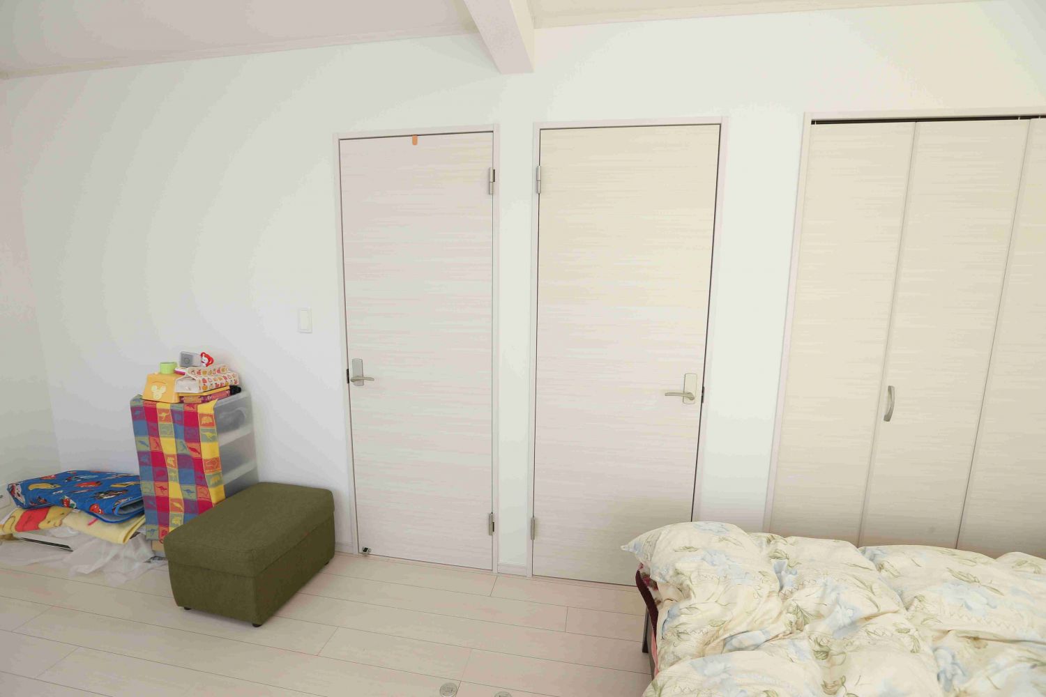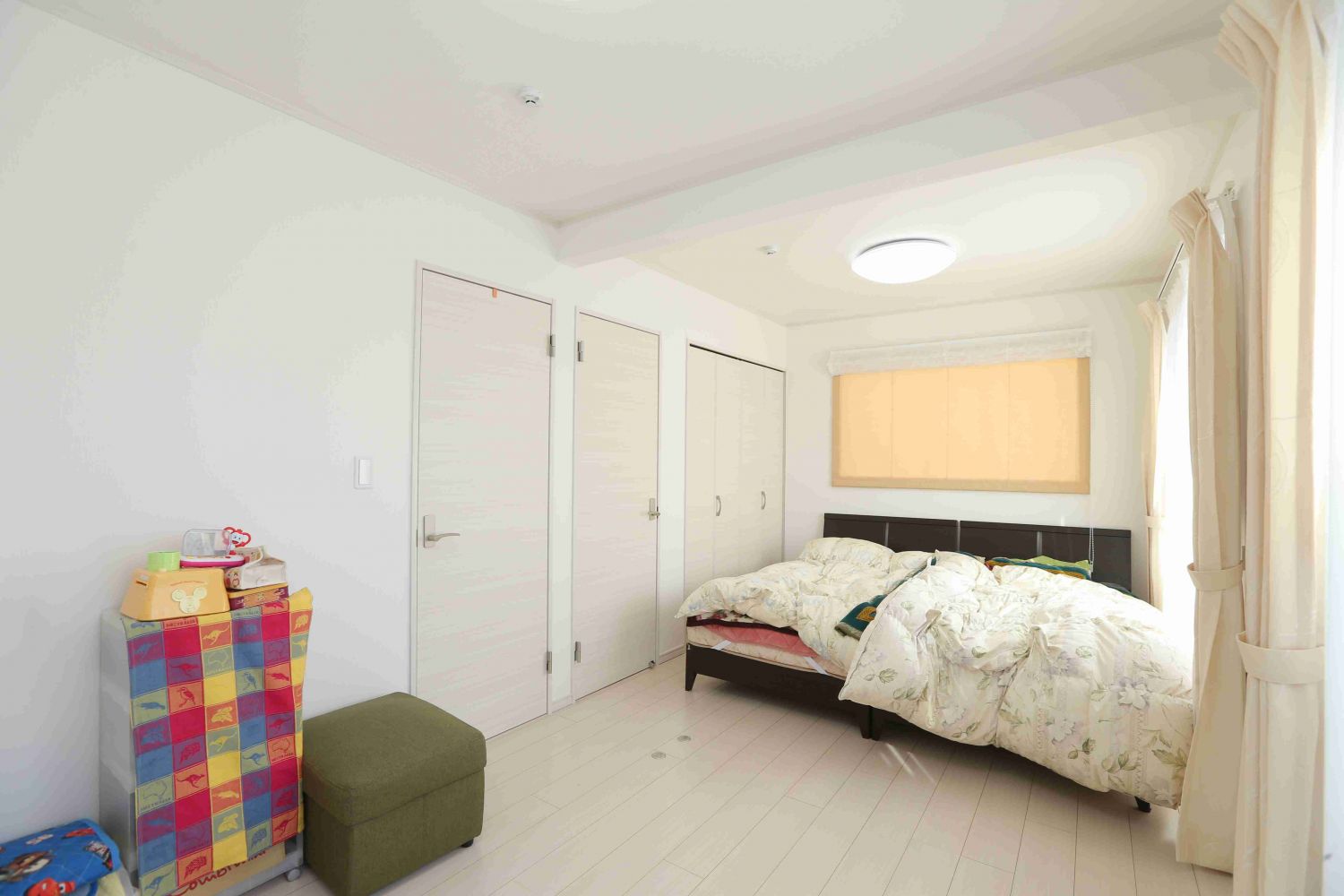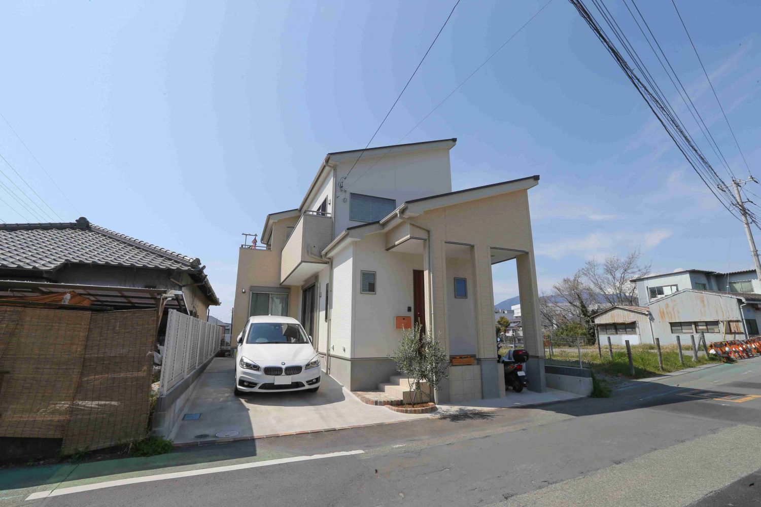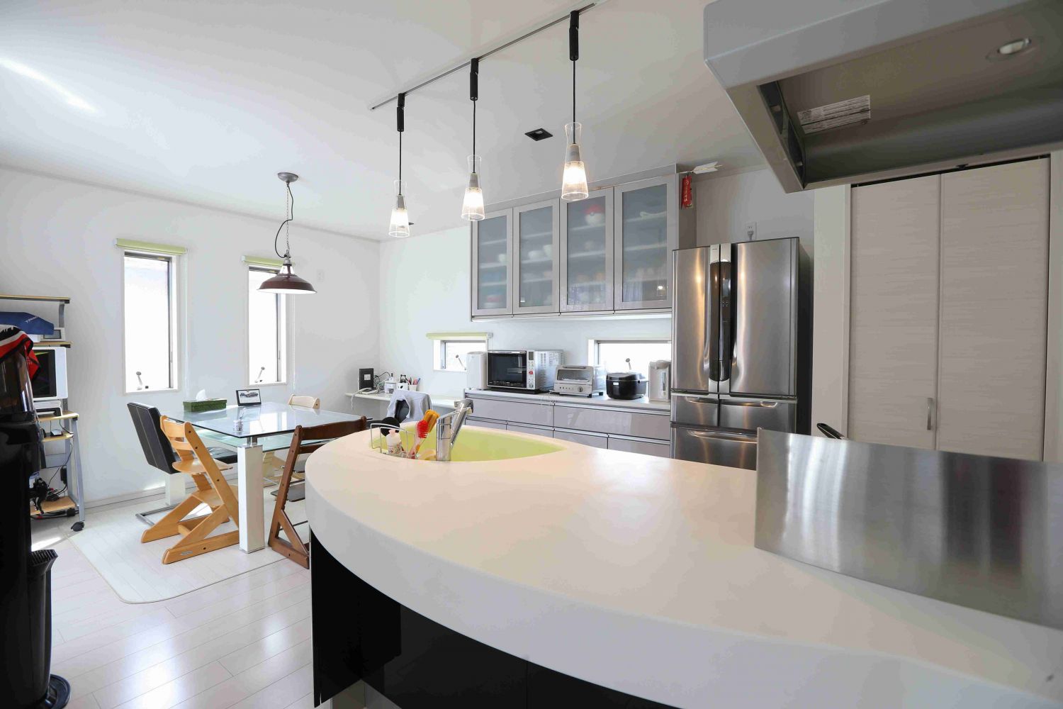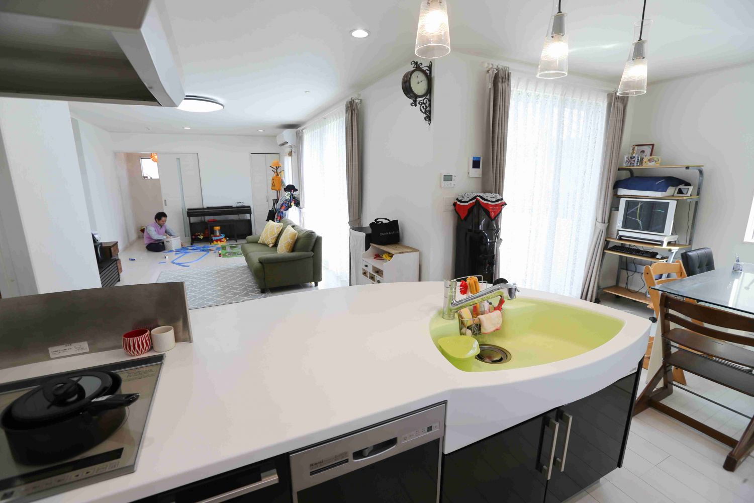 3人のお子様が広く遊べるよう考え設計されたT様邸。リビング階段にすることでリビングのスペースを大きくしました。また対面キッチンからリビング全体を見渡せることが嬉しいポイント。太陽光発電を取り付けたことで、毎月の高熱費は0円。多く発電できた際には売電できるので、家計にやさしいとのことです。