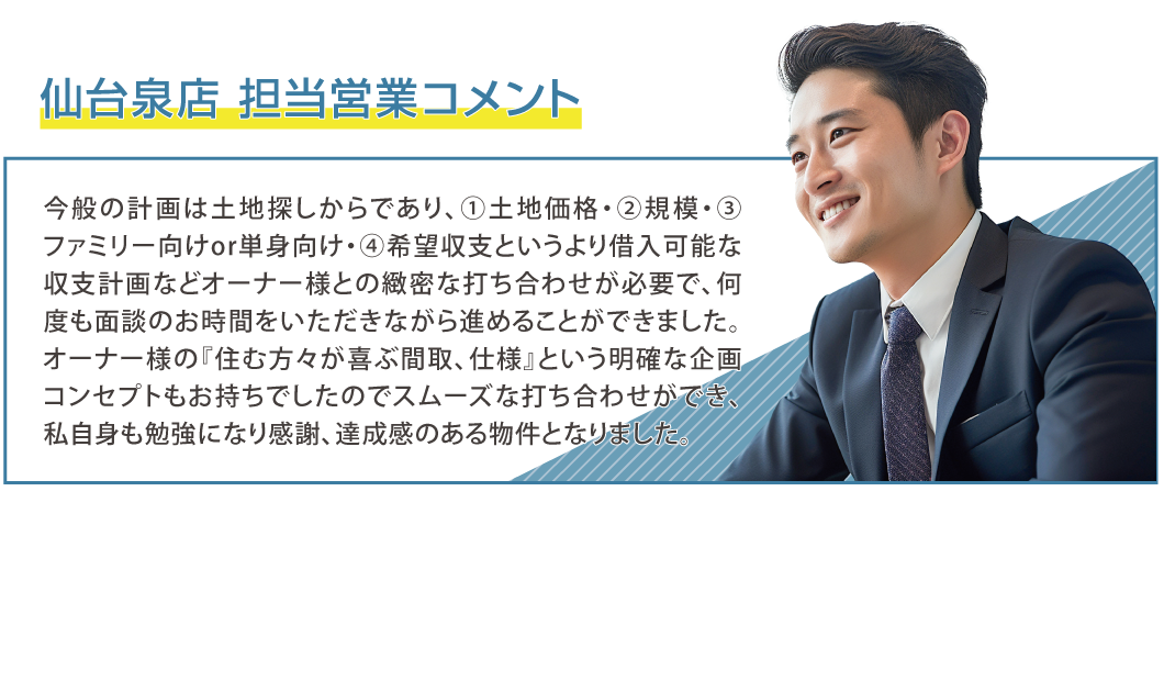 他社では金額的な面で断られてしまったが、アイダ設計では低コストで建てられるため、賃貸住宅を実現させることができました。