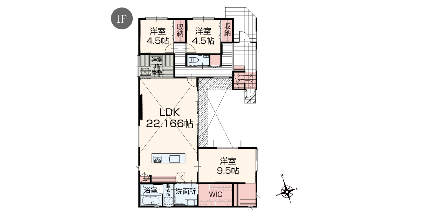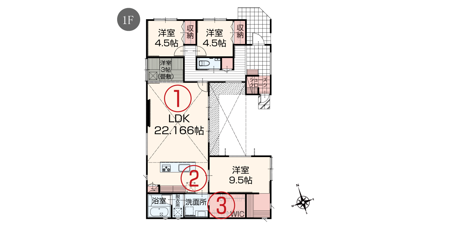 ③広いウォークインクローゼットは洗面所と繋がっており、外出前の身支度や帰宅後の着替えがスムーズです。