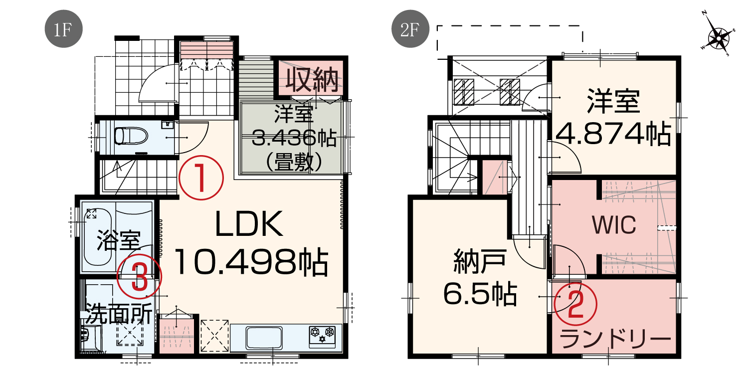 ③浴室、洗面所、キッチンがまとまっており、料理しながらお風呂の準備や洗濯ができるなど家事がしやすい動線です。