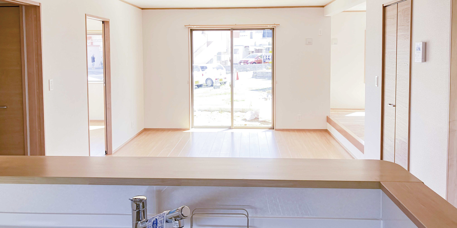 ②6帖の畳敷きの洋室とLDKを下がり壁でゆるやかに仕切ることで、部屋全体の開放感を損なうことなくおしゃれな雰囲気を出しています。
