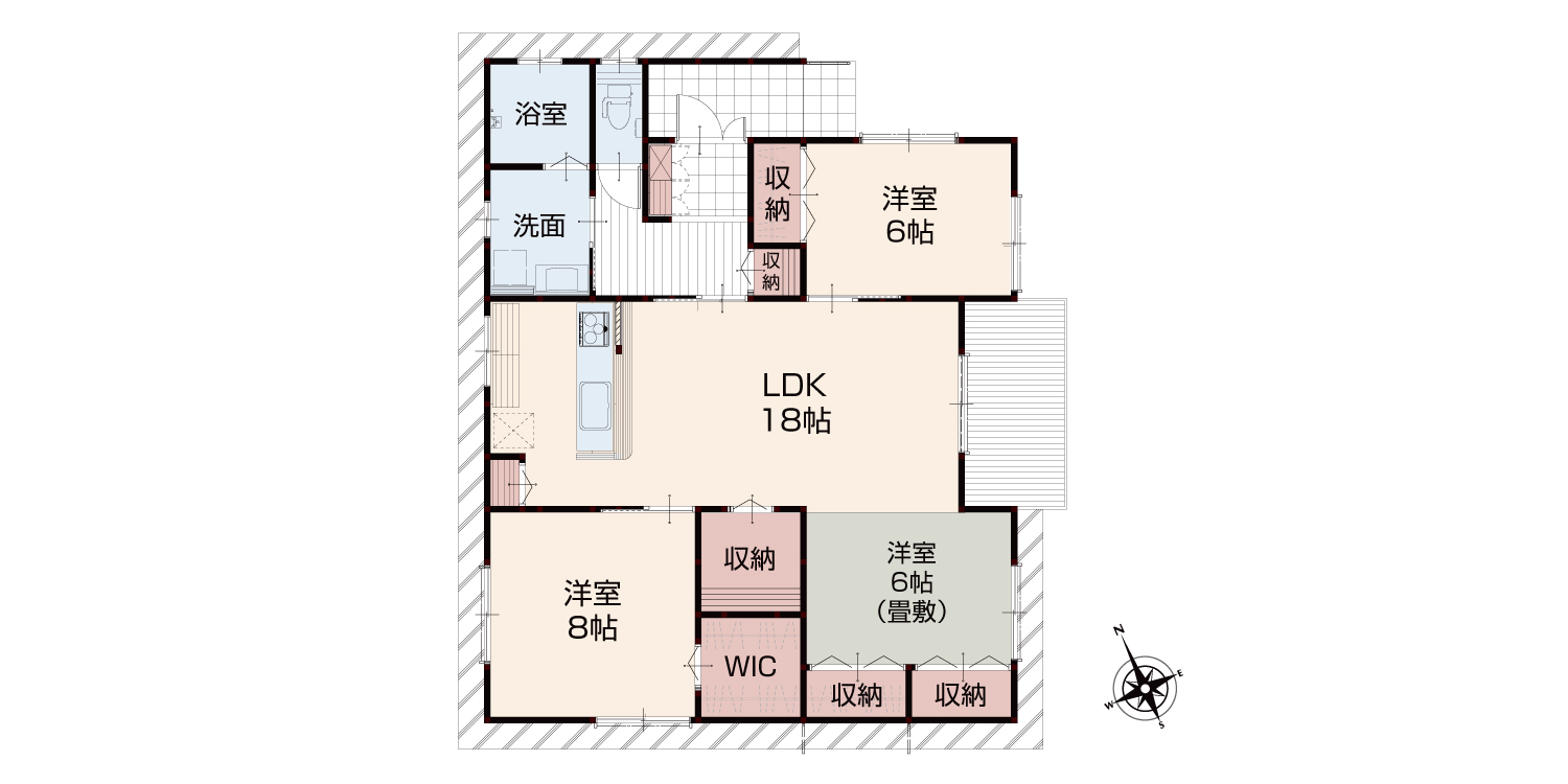 ①ウォークインクローゼットなど大容量の収納スペースを各部屋に設置。衣類や家電、趣味のものなどもスッキリと片付きます。