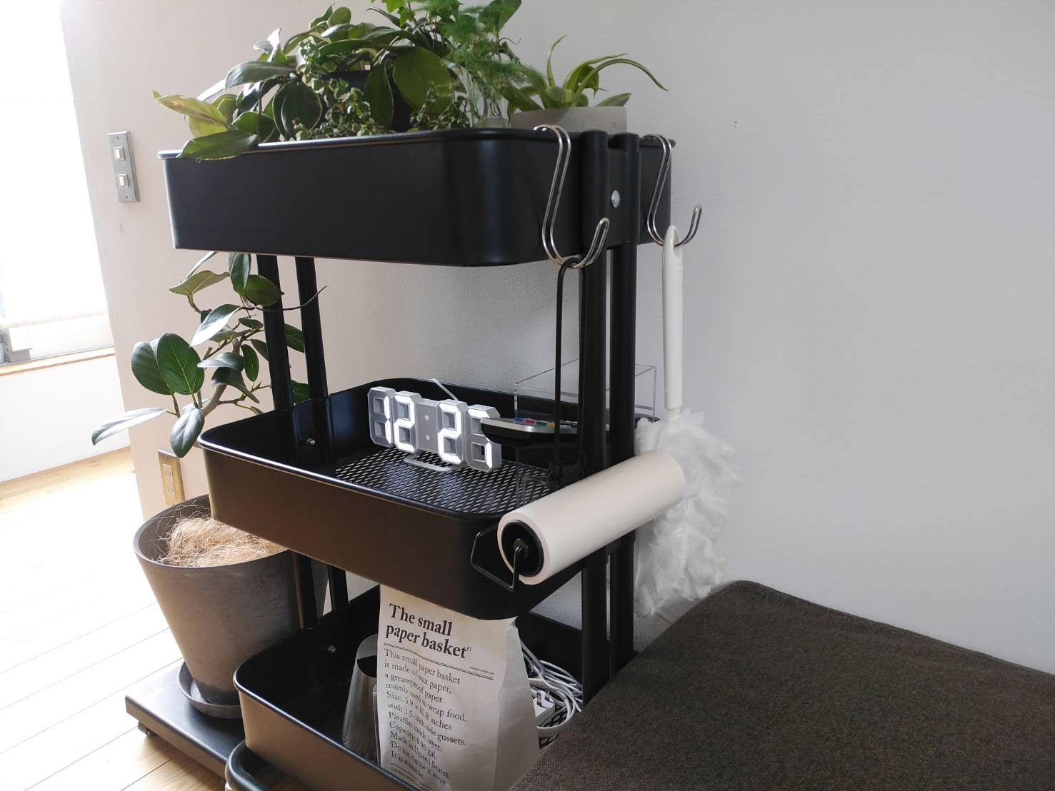 リビングでは、ソファやラグをコロコロクリーナーですぐに掃除できるよう、ワゴンに掛ける収納に。