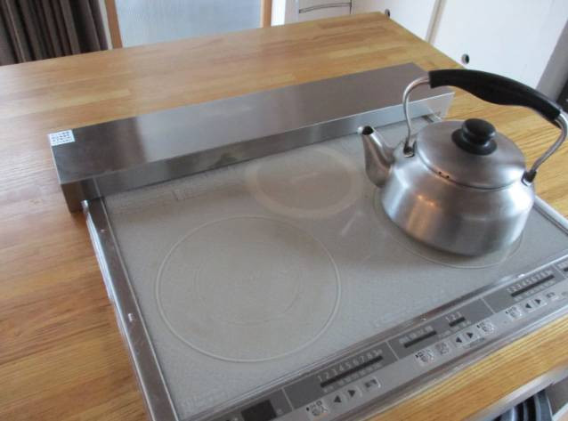 調理中に排気口にゴミが入るのを防ぐため、ネットで購入したステンレス製の排気口カバーを設置。ケトルや鍋をちょこっと置くこともできて便利です。
